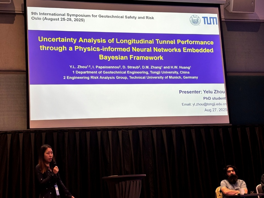 周烨璐博士研究生受邀作了题为《Uncertainty Analysis of Longitudinal Tunnel Performance through a Physics-informed Neural Networks Embedded Bayesian Framework》的口头报告,介绍了一种高效的嵌入参数化物理信息神经网络的贝叶斯更新框架及其在实际工程不确定性分析中的成功应用。