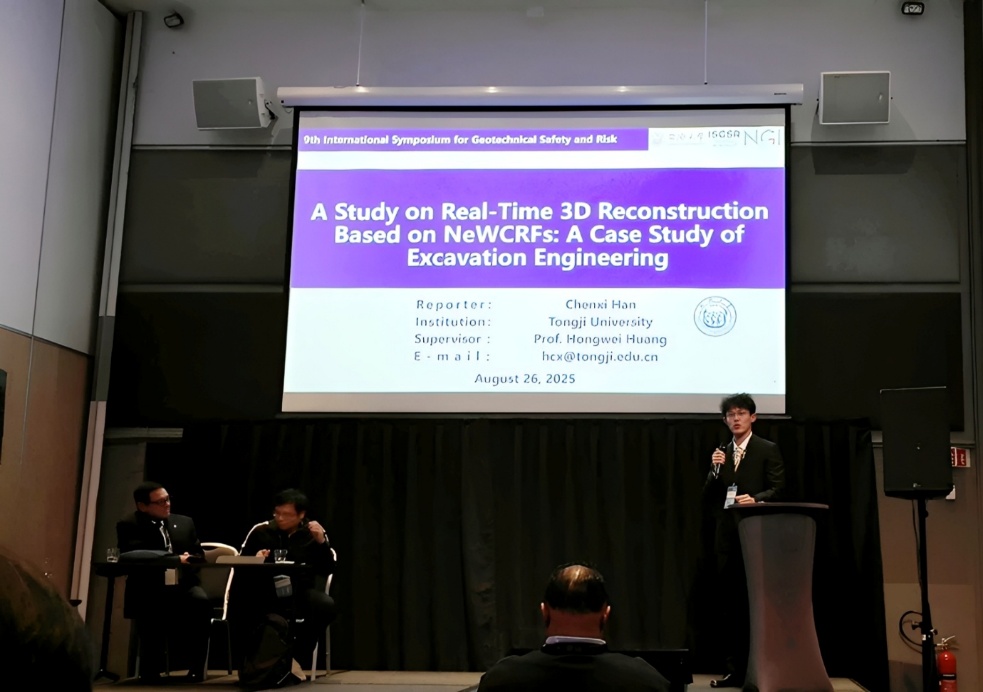 韩晨希硕士研究生受邀进行了题为《A Study on Real-Time 3D Reconstruction Based on NeWCRFs: A Case Study of Excavation Engineering》的口头报告,介绍了一种基于无人机实时三维重建感知基坑工程地表堆载的方法,并建立GUI用户界面,以南京某基坑工程为例进行了现场试验。