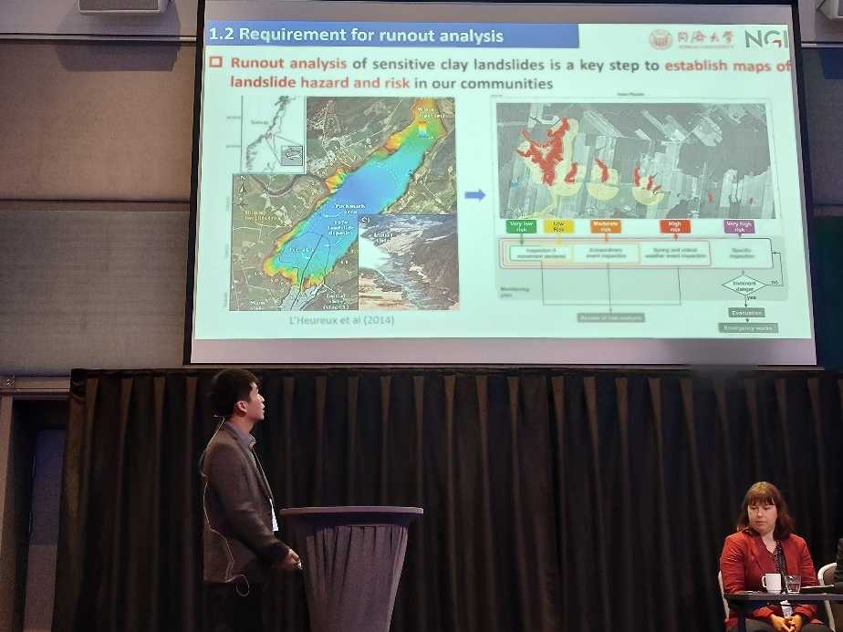 陆盟博士后受邀作了题为《Probabilistic runout analysis of the Gjerdrum sensitive clay landslideusing the NGl-ADPsoft model》的口头报告,介绍了如何使用物质点本构模型准备捕捉敏感土滑坡的大变形行为。报告得到了现场专家的广泛关注,引起了积极提问与交流。