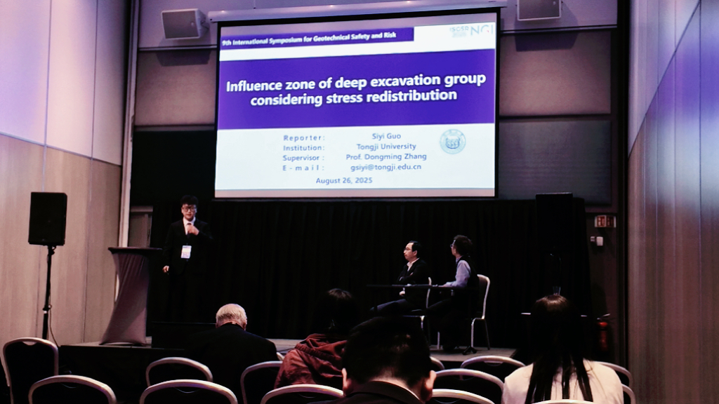 由国际土协ISSMGE TC304/TC309 和ISGSR2025联合举办的数据分析国际竞赛,来自同济大学工程风险团队的姜琪浩、高天润、罗炜和章艺严所提交的方案获学生竞赛荣誉提名奖。本次竞赛得到了工程风险团队黄宏伟教授和张东明教授等的指导。会议期间,姜琪浩博士生代表团队对团队解决方案进行了相关汇报。