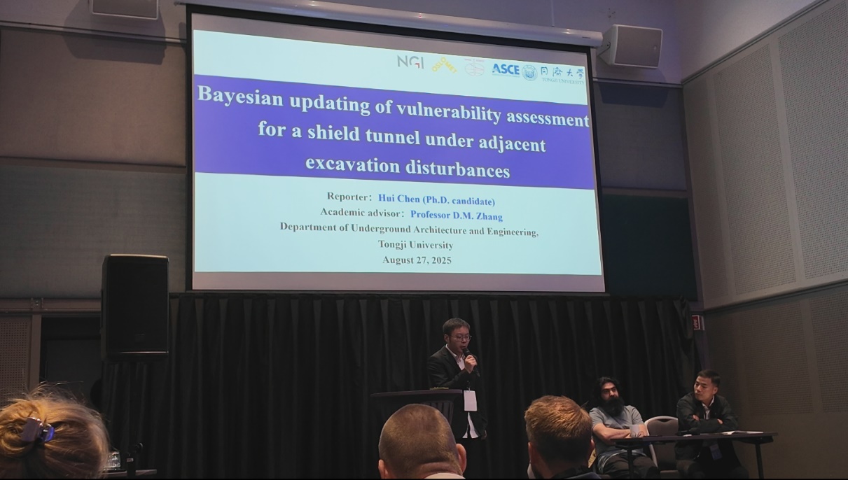 陈辉博士研究生受邀作了题为《Bayesian updating of vulnerability assessment for a shield tunnel under adjacent excavation disturbances》的口头汇报,介绍了一种邻近开挖扰动下隧道管片易损性分析的贝叶斯更新框架,实现了跨地层环境的概率损伤评估。
