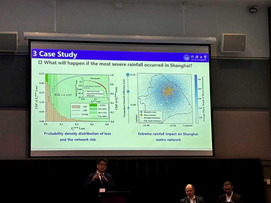 白皓博士研究生受邀作了题为《Extreme Rainfall Induced Flood Risk Assessment Model and Resilience Enhancement Method on Metro Networks》的口头报告,介绍了地下交通网络在极端降雨下风险评估与韧性提升的方法,并将该方法应用于上海地铁网络中。