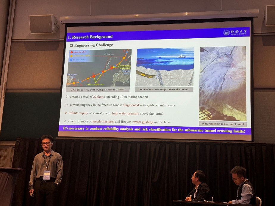 倪佳泽博士研究生受邀作了题为《Investigation of the Impact of Geological Uncertainty on the Risk of Subsea Tunnel Crossing a Fault Zone》的口头报告,介绍了基于提出的荷载指数和抗力指数的可靠度计算和安全风险快速评估方法,并将该模型应用于青岛胶州湾第二海底隧道中。