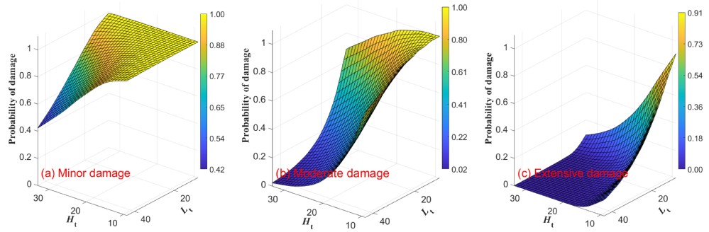 图6 开挖深度H = 16m时, 以Lt和Ht计算的易损性曲面; (a) 轻微损伤; (b) 中等损伤; (c) 严重损伤