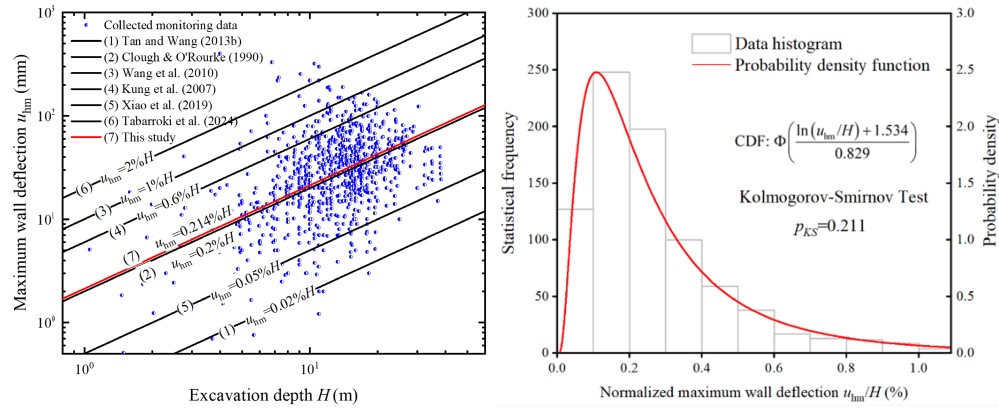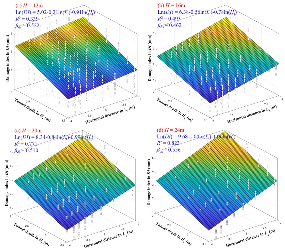 近日,同济大学工程风险研究团队张东明教授、陈辉博士生和薛亚东研究员等在《Tunnelling and Underground Space Technology》期刊上发表了题为“Vulnerability analysis of shield tunnel segmental lining disturbed by adjacent deep excavations in soft soils”的研究论文,通过构建软土地区基坑开挖案例数据库,得到地连墙最大挠度分布,结合扰动数值模型与空间随机场法标定系统刚度与地连墙最大挠度的关系,采用拉丁超立方抽样选取典型数据,利用对数回归分析,建立考虑土体参数、扰动强度不确定性的隧道衬砌损伤演化模型,最终基于对数正态分布函数生成表征隧道损伤概率的易损性曲面。