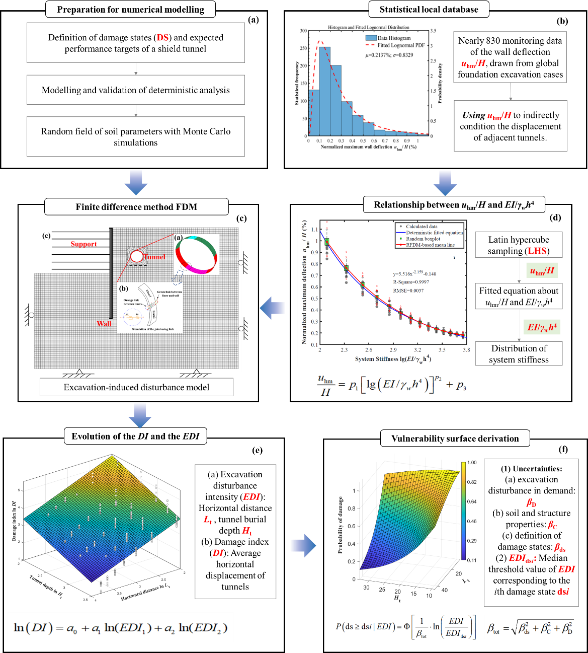 论文提出的邻近开挖扰动下隧道衬砌易损性评估框架(图1),考虑了土体参数和扰动强度的不确定性。方法包括以下步骤:首先,进行损伤状态与相应性能水平定义,构建土体参数随机场等准备工作;其次,收集软土基坑开挖案例形成数据库(图2),为量化易损性曲面提供监测数据;然后,建立有限差分模型模拟隧道对邻近开挖的响应(图3),并验证其有效性;通过随机有限差分法(RFDM)标定地连墙最大挠度与系统刚度的关系(图4);利用拉丁超立方抽样从数据库选取典型数据反算系统刚度,进行大量数值计算,通过对数回归分析研究损伤指标(DI)与开挖扰动强度(EDI)的演化关系(图5);最后,基于对数正态分布函数构建易损性曲面,量化隧道在开挖扰动下的损伤概率(图6)。