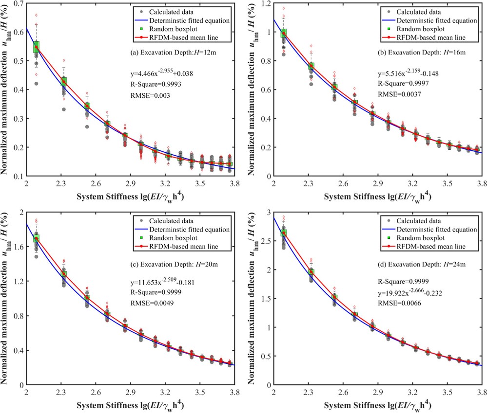 图4 不同开挖深度下uhm/H与lg(EI/γwh4)的关系: (a) H=12m; (b) H=16m; (c) H=20m; (d) H=24m