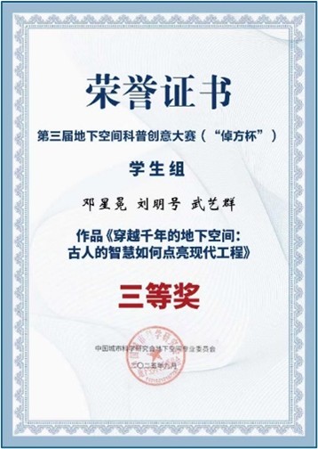 团队邓星冕、刘明号与武艺群硕士研究生的作品在学生组比赛中位列第5名,获三等奖(图1),指导老师为张冬梅老师及黄忠凯老师(获优秀指导教师奖)。作品题目为“穿越千年的地下空间:古人的智慧如何点亮现代工程”,从力学原理、风险防控智慧等方面介绍了古代地下建筑空间的设计巧思,用古人的智慧启发现代地下结构建设(图2)。