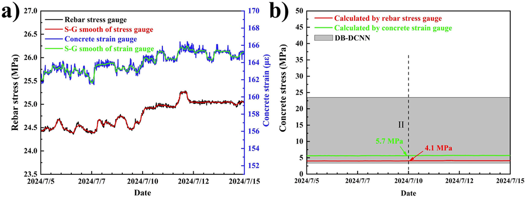 图5 现场混凝土结构中钢筋应力和混凝土应变的监测数据以及相应的应力计算结果