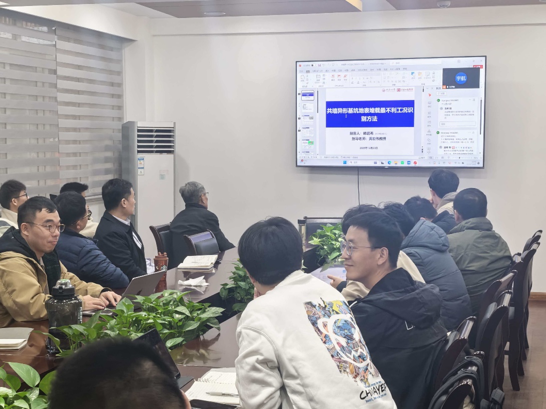 在风险识别和多基坑施工关键词研讨中,韩晨希同学汇报了共墙异形基坑地表堆载最不利工况识别的相关工作;张维同学汇报了多源荷载对基坑群相互作用机制影响的物理模型试验方案;郭思怡同学则围绕WSS测点布置与现场安装流程汇报了实际现场情况及相关研究工作。三位同学的研究依次为风险控制的关键工况筛选提供依据,揭示荷载叠加条件下基坑群相互作用机理及其演化规律,最终形成从监测设计到现场部署的工程化技术链条支撑后续数据获取与分析。此外,参会老师及同学针对本课题展开了深入的讨论,提出了针对性的建议。